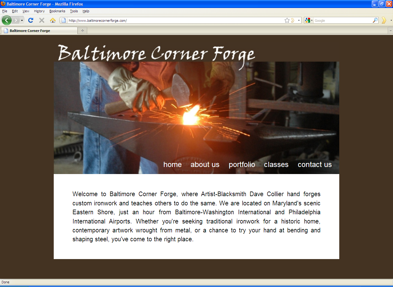 In November 2009, a local Artist Blacksmith was looking for a Web site to showcase his custom ironwork and class offerings. I designed and built this site to complement the artistic style of the work being showcased. I also used PHP coding techniques to facilitate quick and easy changes to the structure and layout of the site down the road as additional features are added. To take a closer look, see the larger screenshot or the live site.