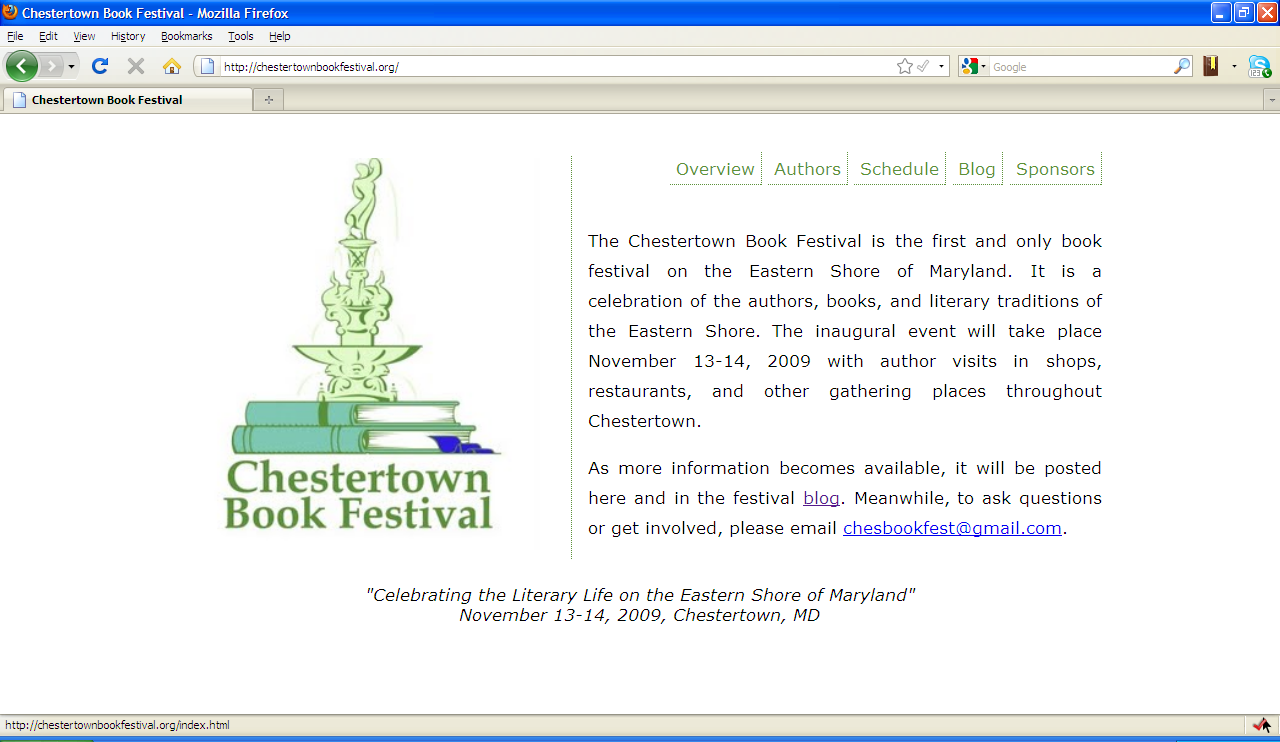 Then in September 2009, I designed and built the official Web site of the Chestertown Book Festival. The purpose of this site is to promote and inform the public about the first ever book festival coming to the Eastern shore of Maryland, November 13-14, 2009. The site uses XHTML and CSS techniques. Click for a larger screenshot or to view the live site.