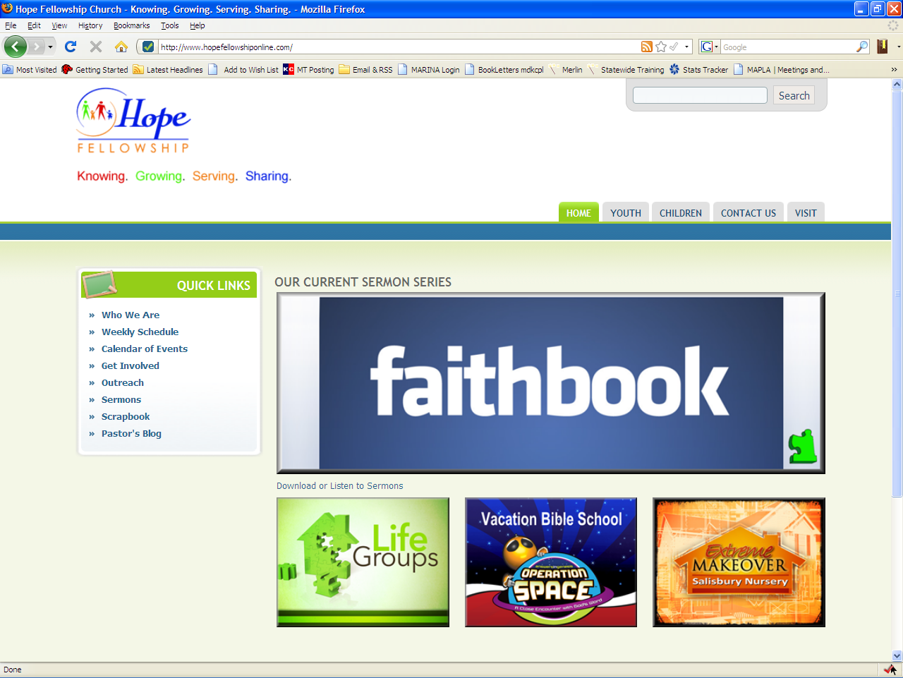 More recently, in January 2009, I created the site on the right for Hope Fellowship Church in Chestertown, MD. I built the site using Drupal content management system so the site owners could easily maintain and update the site themselves. The site includes a blog as well as audio and video content. To take a closer look, see the larger screenshot or the live site.