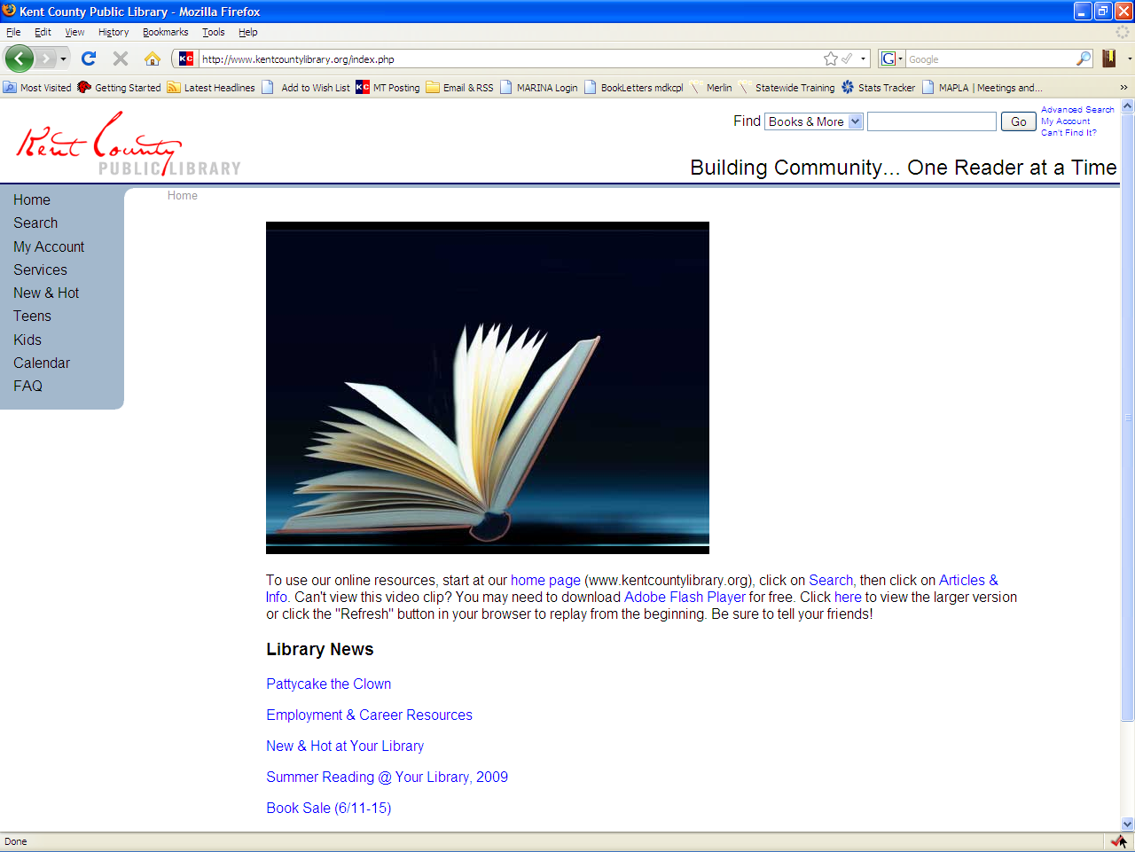 In January of 2008 I redesigned the Kent County Public Library's web site, shown on the left, using XHTML, PHP, and CSS and continue to maintain it. The library was interested in a simple look and feel with a focus on ease of use. They also wanted to feature blog posts on their home page. To see more details from the site, click to view a larger screenshot or the live site.